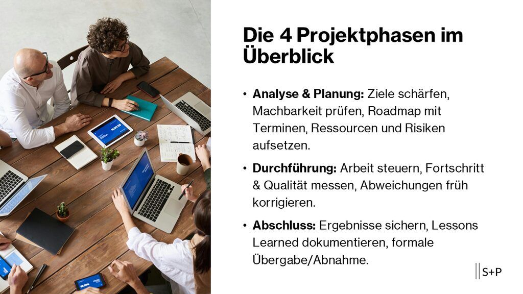 Die 4 Projektphasen im Projektmanagement: Analyse, Planung, Durchführung, Abschluss Effektives Projektmanagement folgt einem klaren Ablauf: Analyse → Planung → Durchführung → Abschluss. Jede Phase hat eigene Ziele, Aufgaben und typische Risiken. Hier bekommst du einen kompakten, praxisnahen Leitfaden – inklusive Checklisten, Beispielen und...